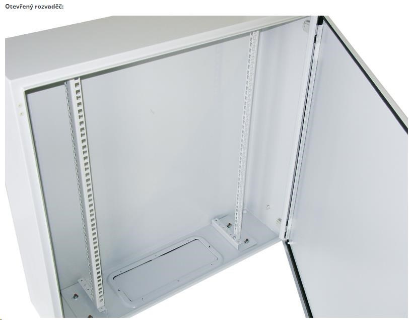 Venkovní nástěnný rozvaděč vyrobený z válcované oceli o tloušťce 1,5 mm.Třívrstvá povrchová úprava. Provedení: dveře - plné, otevíratelné o 110°, zaměnitelný směr otevírání, těsnění z pěnového polyuretanu zádní kryt - plný boční kryt - plný horní kryt - plný