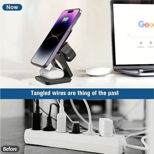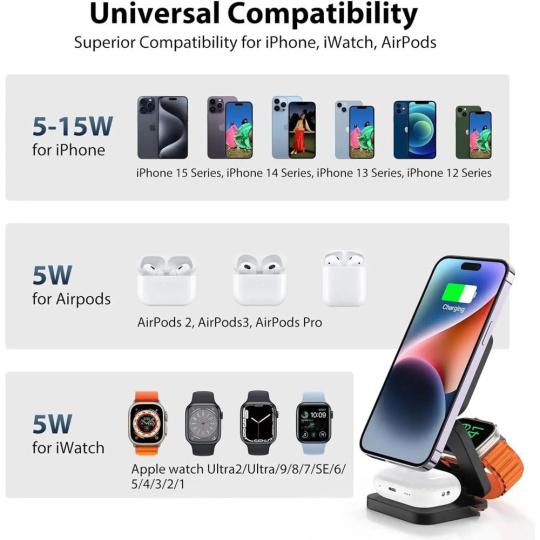 Kvalitní výkonná bezdrátová skládací 3 in 1 s podporou Apple MagSafe, iWatch, AirPods, ale i většiny telefonů, či příslušenství jiných značek podporujících bezdrátové QI nabíjení. Unikátní skládací řešení Vám umožňuje zvolit variantu použítí pouze jako podložku pro jedno zařízení, nebo jako stojánek a nabíjet až tři zařízení. Nabíječku lze opět jednoduše složit do malé kompaktní podoby a v případě potřeby vzít jednoduše kamkoli budete potřebovat.