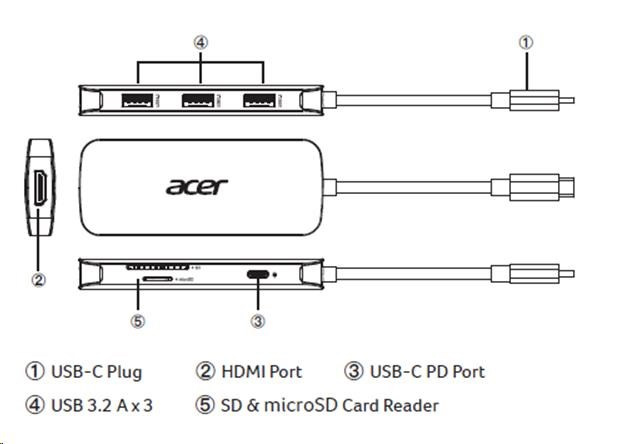 ACER Dokovací stanice 7in1 Type-C dongle, 1x HDMI, 3x USB-A 3.2 Gen1, 1x SD 3.0, 1x microSD, 1x USB-C, silver
