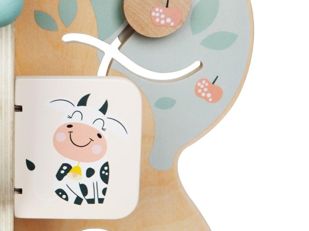Activity board v podobě stromu zavede holčičky i chlapce na farmu, kde si pohrají s hracími prvky a zvířátky, která mohou vidět ve svém okolí, na venkově, na farmě. Příjemné pastelové barvy a motiv zvířátek dodávají hračce lákavý vzhled a lákají k pečlivému prozkoumání. Activity board strom vede děti k samostatnosti ve hře, v poznávání a učení se, zdokonaluje dětské dovednosti..