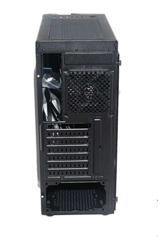 Počítačová skříň se skleněným bočním krytem a RGB podsvětlením panelu.