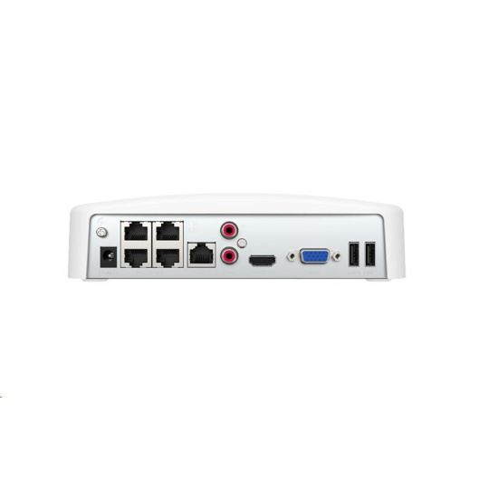 • Porty: 4x LAN PoE RJ45 port 10/100 Mb/s pro připojení kamer, 1x LAN RJ45 port 10/100 Mb/s pro připojení k Internetu, 2x RCA zvuk, 1x HDMI, 1x VGA, 2x USB 2.0, 1x Napájecí Jack