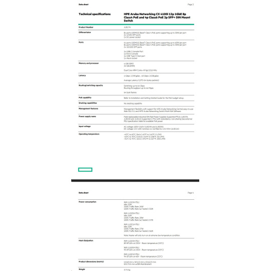 | Maximum heat dissipation BTU/hr | With JL819A PSU: 89 BTU/hr at 230V - Room temperature (25°C) With JL820A PSU: 95 BTU/hr at 230V - Room temperature (25°C) With JL821A PSU: 94 BTU/hr at 48V - Room temperature (25°C) | |