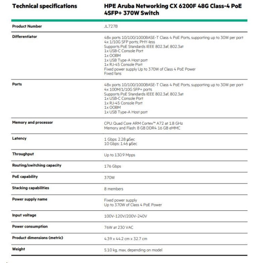 HPE Aruba Networking CX 6200F 48G Class4 PoE 4SFP+ 370W Switch JL727A RENEW