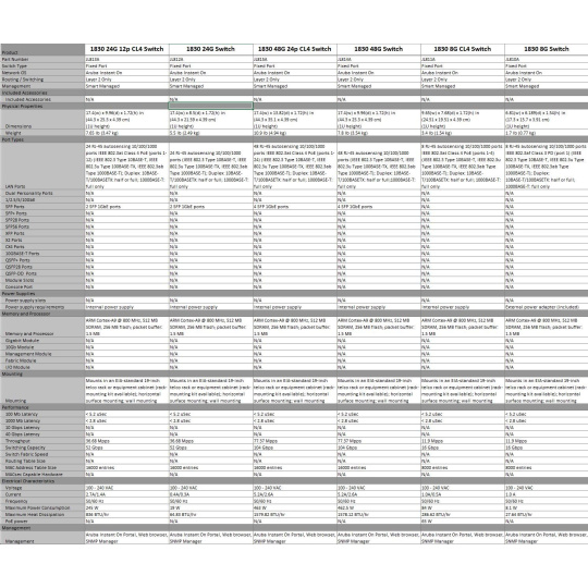 | Aruba Instant On 1830 8G Switch (JL810A) | Aruba Instant On 1830 8G 4p Class4 PoE 65W Switch (JL811A) | Aruba Instant On 1830 24G 2SFP Switch (JL812A) | Aruba Instant On 1830 24G 12p Class4 PoE 2SFP 195W Switch (JL813A) | Aruba Instant On 1830 48G 4SFP Switch (JL814A) | Aruba Instant On 1830 48G 24p Class4 PoE 4SFP 370W Switch (JL815A) | ||||||||