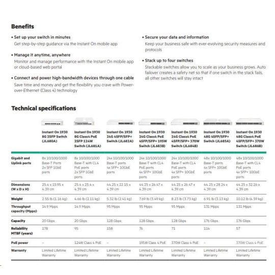 | High-Performance, Smart-Managed Switches Designed with Small Businesses in Mind Whether you own a cafe, a design firm or a tech startup, a reliable and secure network plays a critical role in the success of your business. And you need a network solution that gives you peace of mind, allowing you to focus on growing your business instead of managing problems with your network. Aruba Instant On makes it easy to keep network users happy, mobile and IoT devices connected, and your network secure. The Aruba Instant On 1930 switches features advanced, smart-managed, fixed- configuration Gigabit switches designed for small businesses that are easy-to-deploy and affordable. They're made to handle today's bandwidth-heavy applications like voice and video conferencing, enabling consistent connectivity to enhance performance. Using either the Instant On mobile app or the cloud-based web portal, you can quickly set up, monitor and manage the 1930 switch series from anywhere at any time. What's more, up to 30 W PoE power delivery is available out-of-the-box for your class 4 PoE devices, like access points, surveillance cameras and VoIP phones, all easily managed from the same platform. Built-in security features protect your network from unauthorized access by allowing you to segment traffic and define access to each area of the network. And all of this is included in the price of the hardware - there are no hidden subscription or licensing fees. |