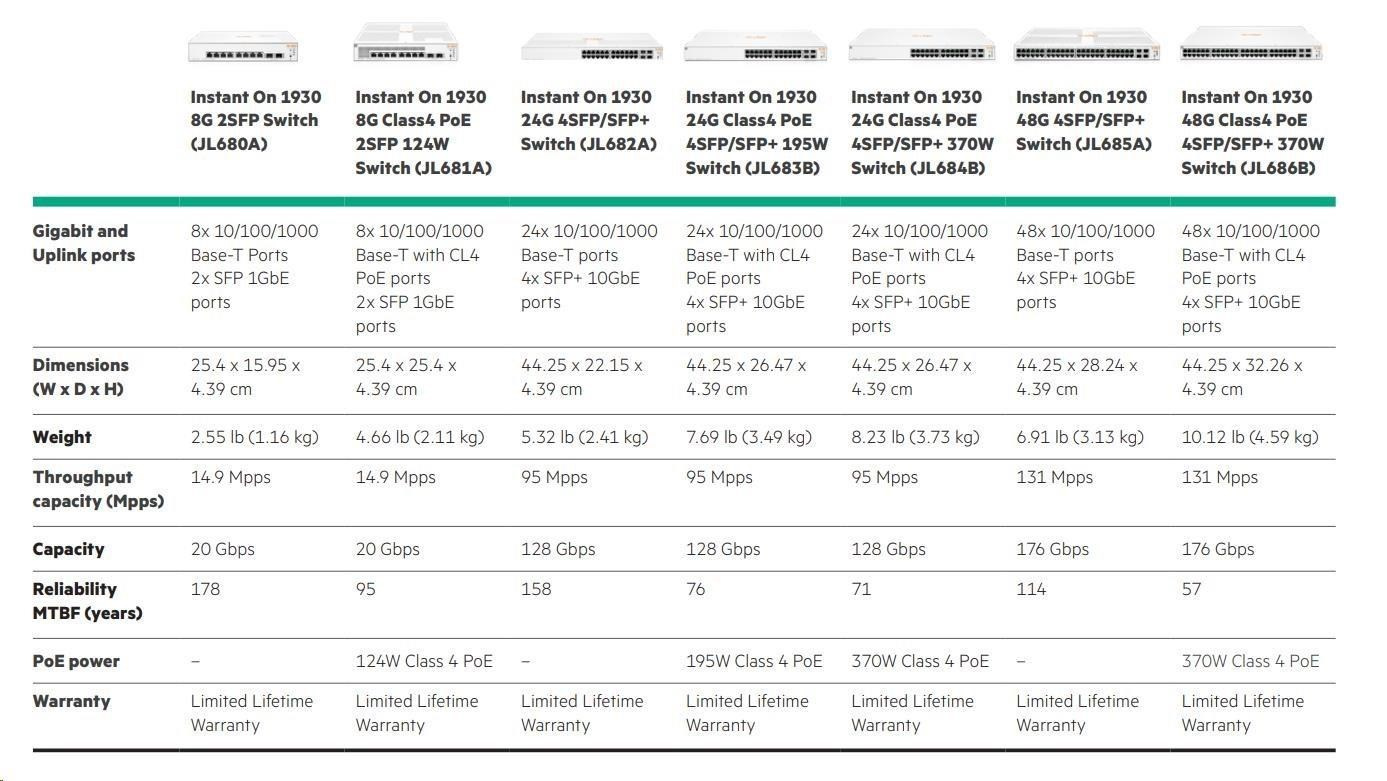 | The Instant On Differentiators Easy Setup and Management The Aruba Instant On mobile app allows you to set up, manage, and monitor Instant On switches and access points directly from your phone. Within the app, you get guided step-by-step instructions to install Instant On devices to get your network up and running quickly - no technical expertise required. And cloud-based access allows you to access the network from anywhere, at any time. Non-intrusive, Aesthetic Design Aruba Instant On switches are designed to complement the sleek and clean look of the Instant On access points, and to blend discreetly into your site's environment. The 8-port models, as well as the 24- and 48-port non PoE models, are fan-less, making them ideal for quiet office deployments. High Performance with Flexible Options The series consists of four (4) Class 4 PoE switches, and three (3) non-PoE switches including 8- 24- and 48-port Gigabit Ethernet switches. The two (2) dedicated 1G SFP fiber ports on 8-port models, and four (4) dedicated 1G/10G SFP+ fiber ports on 24-/48-port models, ensure high performance and eliminate traffic bottlenecks across the network. Customizable features include basic Layer 2 features like VLANs and link aggregation, as well as advanced features such as Layer 3 IPv4 static routing, ACLs, and Spanning Tree Protocols, and IPv6 Host mode. Optimized User Experience The Aruba Instant On mobile app provides common workflows for Instant On switches and access points making it easier to configure, monitor and manage your network remotely without the need for additional hardware like cloud keys or VPN. You can also update firmware on your Instant On devices directly from the cloud whenever you want, from wherever you are. Site inventory The site inventory feature on the Instant On mobile app shows you all switches and AP's on a single screen, allowing you to quickly identify non-functioning devices and troubleshoot accordingly. Multi-Site Management The cloud-hosted web interface and mobile app make it easy to manage multiple sites, multiple networks, distributed deployments and multi-tenant deployments. Each site is logically separated and has its own configuration, statistics, guest portal, and admin read/write privileges. Built-In Security Built-in security features protect your network from external threats by blocking malware attacks and keeping unauthorized users off the network. Network traffic can be filtered and access restricted based on MAC and IP address. No Hidden Fees All features are included in the price of the hardware - there are no recurring subscription or licensing fees. Expert-level support and industry leading limited lifetime warranty are also included, along with chat support for the life of the product. |