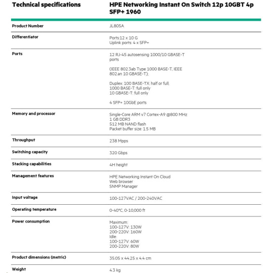 HPE Networking Instant On Switch 12p 10GBT 4p SFP+ 1960 (JL805A)