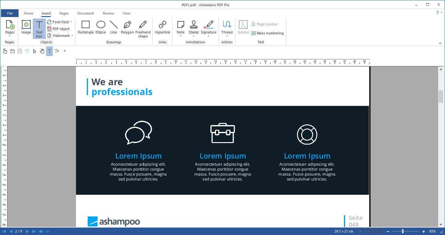 Pracujte chytřeji a šetřete kliknutí s inteligentními funkcemiAshampoo PDF Pro 5 předvídá vaše potřeby a poskytuje znatelné pohodlí při každodenním používání. Když otevřete PDF soubor z Průzkumníka Windows, zobrazí se nyní jako nová karta ve vašem stávajícím okně. Nové zobrazení Rozvržení knihy zobrazuje dvě stránky vedle sebe, stejně jako skutečná kniha, a posouvání po stránkách umožňuje přesunout se přesně o jednu stránku na jedno otočení kolečka myši. Přetáhněte dva soubory PDF do programu a spusťte okamžité porovnání dokumentů, abyste na první pohled viděli rozdíly. Při přidávání textu si Ashampoo PDF Pro 5 pamatuje naposledy použité písmo a velikost, čímž zajišťuje konzistentní vzhled bez nutnosti ručního upravování.