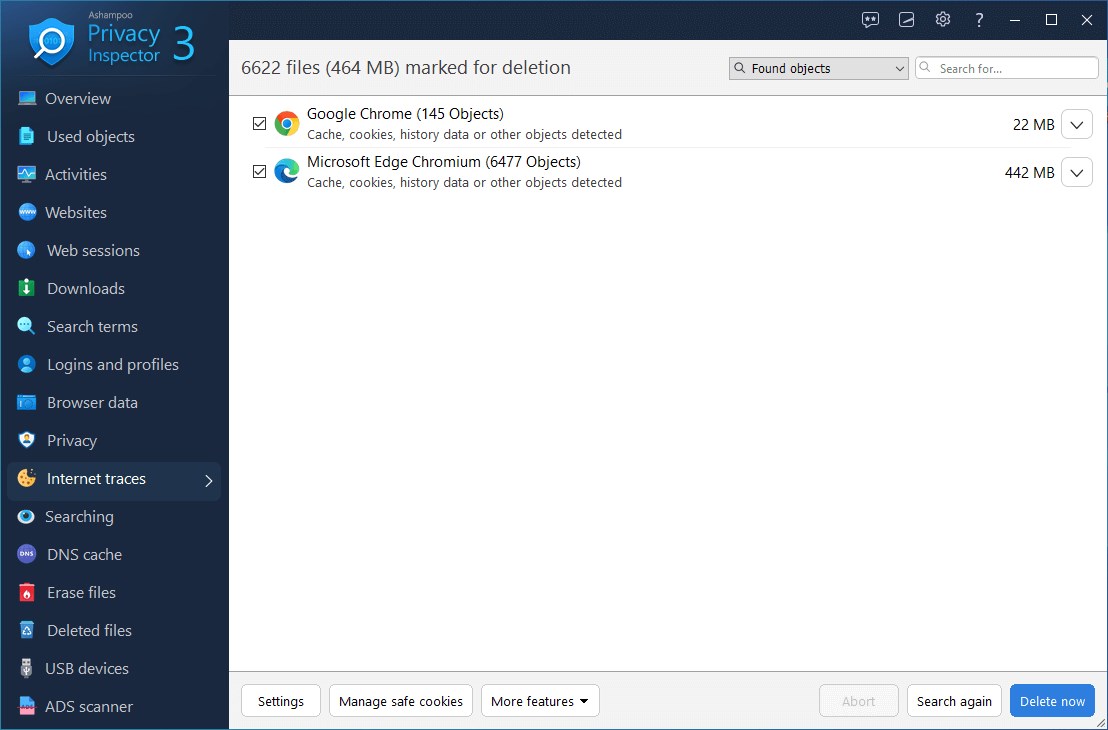 Někdy potřebujete zkontrolovat své poslední aktivity na internetu. Jak jste se na danou stránku dostali a co jste hledali? Ashampoo Privacy Inspector vám pomůže analyzovat webové relace pomocí rozsáhlého seznamu nebo stromového zobrazení, které zahrnuje všechny vaše online aktivity. Oživte svou historii prohlížení webu a už nikdy neztraťte nit.