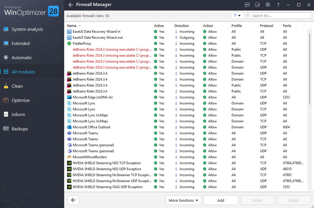 Máte přehled o tom, které aplikace mají přístup k internetu? Zajímá vás, co přichází a odchází a která pravidla mohou být zastaralá? S novým Správcem brány Firewall můžete plně kontrolovat síťový provoz. Snadno zjistíte, co je povoleno a kde by bylo třeba zasáhnout. Díky základnímu, standardnímu a pokročilému režimu, inteligentním filtrům a filtru pro vyhledávání deaktivovaných nebo chybných pravidel rychle zjistíte, které aplikace mohou odesílat nebo přijímat data, a můžete rozhodnout, co má být povoleno nebo blokováno. Převezměte zpět kontrolu nad provozem svého počítače pouhými několika kliknutími.