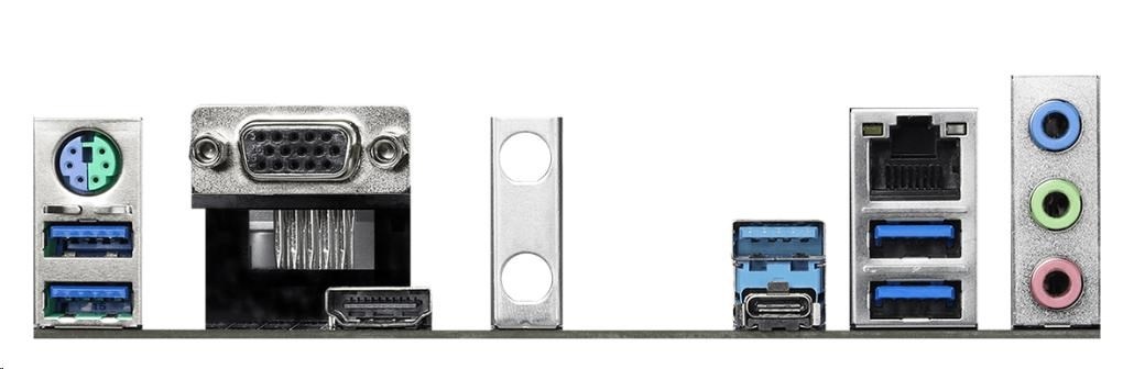 | Rear panel I/O | - Antenna Bracket - 1 x PS/2 Mouse/Keyboard Port - 1 x D-Sub Port - 1 x HDMI Port - 1 x USB 3.2 Gen2 Type-A Port (10 Gb/s) (Supports ESD Protection) - 1 x USB 3.2 Gen2 Type-C Port (10 Gb/s) (Supports ESD Protection) - 4 x USB 3.2 Gen1 Ports (Supports ESD Protection) - 1 x RJ-45 LAN Port with LED (ACT/LINK LED and SPEED LED) - HD Audio Jacks: Line in / Front Speaker / Microphone |