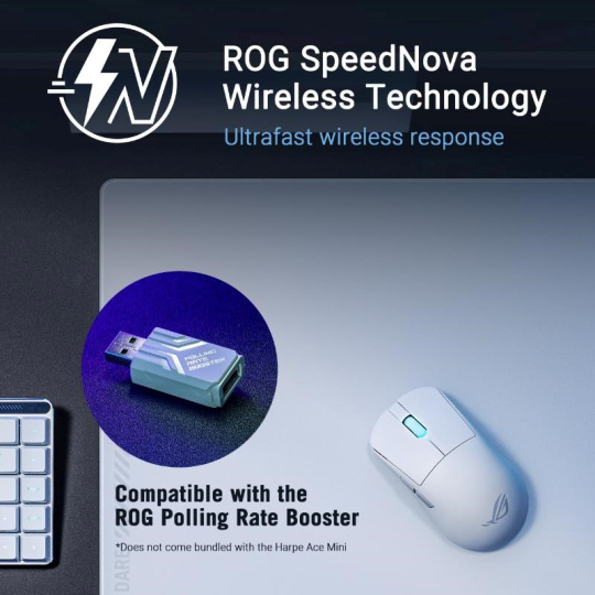 ROG Harpe Ace Mini je ultralehká 49gramová polosymetrická herní myš s tvarem schváleným profesionálními hráči FPS. ROG Harpe Ace Mini je vybaven optickým senzorem ROG AimPoint Pro s rozlišením 42 000 dpi a optickými mikropřepínači ROG a zobrazuje špičkový bezdrátový výkon s bezdrátovou technologií SpeedNova a podporuje až 8 000 Hz bezdrátovou rychlost dotazování (kompatibilní s ROG Polling Rate Booster).
