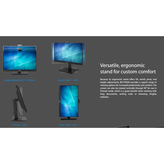 ASUS BE279QSK Video Conferencing Monitor - 27 inch, Full HD, IPS, Frameless, Full HD Webcam, Mic Array, Stereo Speakers, Height Adjustable, Ergonomic Design, HDMI, Eye Care, Low Blue Light, Flicker Free, Wall Mountable