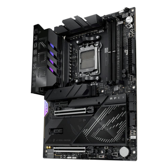 AMD X870E (AM5 Socket) ATX motherboard, Advanced AI PC-ready, 18+2+2 power stages, Dynamic OC Switcher, Core Flex, DDR5 slots with AEMP, ROG Memory Fan Kit for DDR5 overclocking, Wi-Fi 7 with ASUS WiFi Q-Antenna, three PCIe 5.0 M.2 slots onboard, two PCIe 4.0 slots on an ROG DIMM.2 card, PCIe 5.0 x16 SafeSlots with PCIe Slot Q-Release Slim and full support for next-gen graphics cards, two USB4 ports, two USB 20Gbps Type-C front-panel connectors (one with Quick Charge 4+ up to 60W and USB Wattage Watcher), AI Overclocking, AI Cooling II, and AI Networking II
