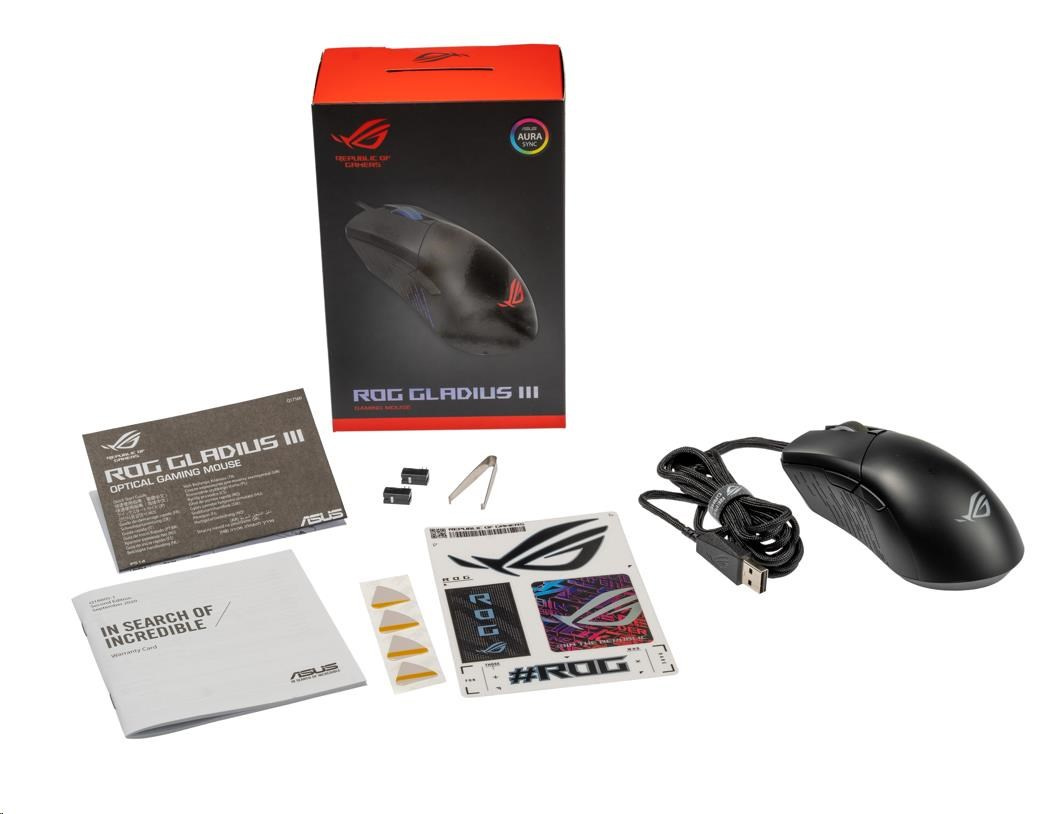 - Aura RGB Lighting - The ROG logo, scroll wheel, and ROG markings along the side of ROG Gladius III feature integrated ROG Aura RGB lighting. The laser-engraved side panel also features special flicker effects that can be customized with the color of your choice.