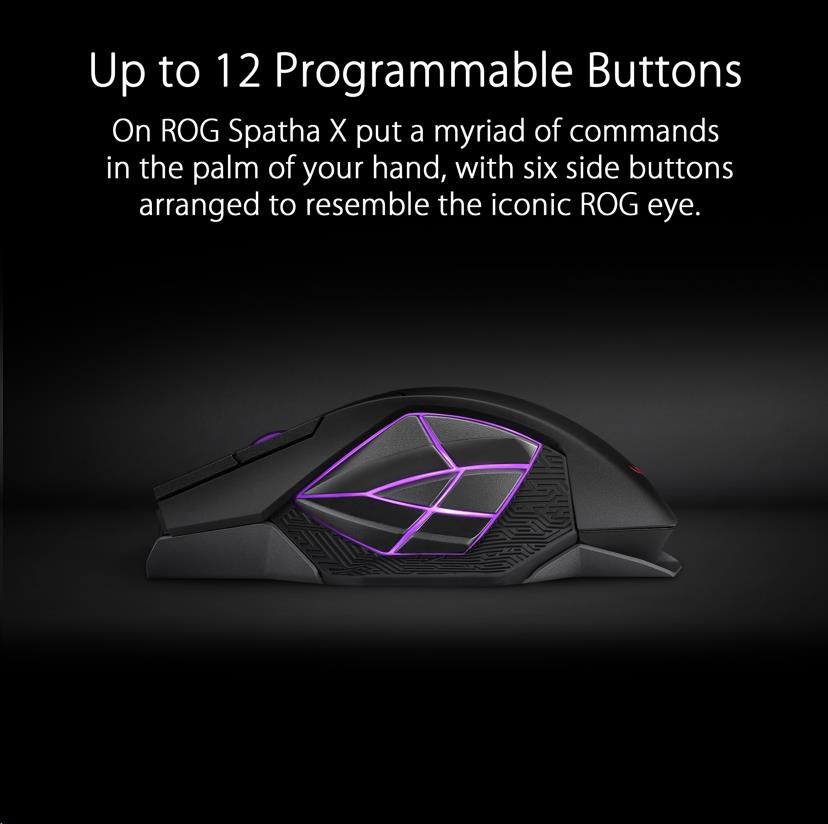 - Up to 12 Programmable Buttons - The 12 programmable buttons on ROG Spatha X put a myriad of commands in the palm of your hand, with six side buttons arranged to resemble the iconic ROG eye. The placement of each button has been carefully considered so they’re within reach, and all have been designed to provide a tactile click feel for intuitive, responsive control.
