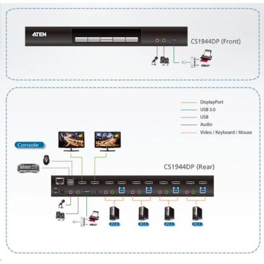 Přepínač KVM ATEN CS1944DP pomáhá organizovat pracovní plochu. Zvláště při správě multimediální pracovní stanice ve velké organizaci nabízí CS1944DP uživatelům okamžitý přístup ke čtyřem počítačům,