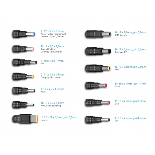 Univerzální nabíjecí adaptér pro notebooky AVACOM QuickTIP 90W dokáže se svými 13 různými konektory napájet drtivou většinu vyráběných notebooků oblíbených značek Acer, Asus, Compaq, Dell, Fujitsu/Siemens, Gateway, HP, IBM, LG, Lenovo, MSI, Packard Bell, Samsung, Sony, Toshiba, eMachines i jiných zařízení, vyžadujících napájení ze sítě.