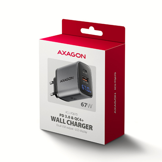 AXAGON ACU-PQ67D, GaN nabíječka do sítě 67W, výstup USB-A + USB-C, PD3.0/PPS/QC4+/SFC2.0/Apple, LCD display