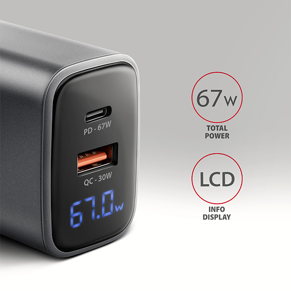 AXAGON ACU-PQ67D, GaN nabíječka do sítě 67W, výstup USB-A + USB-C, PD3.0/PPS/QC4+/SFC2.0/Apple, LCD display