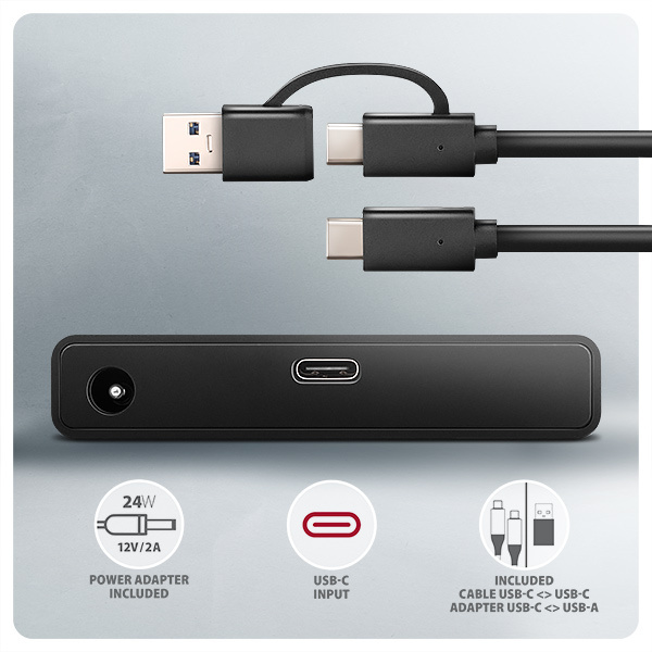 V balení naleznete 60 cm kabel USB-C <-> USB-C s napevno uchycenou redukcí USB-C -> USB-A. Toto řešení zvyšuje univerzálnost adaptéru, který tak můžete připojit k jakémukoliv USB portu počítače, ať už k oboustrannému USB-C konektoru nebo k tradičnímu USB-A konektoru. Součástí balení je také napájecí adapter 12V/2A (24W) pro napájení 3.5" pevných disků. Adaptér s 2.5" SSD/HDD stačí napájet po USB sběrnici, odpadá tak manipulace se síťovým napáječem.