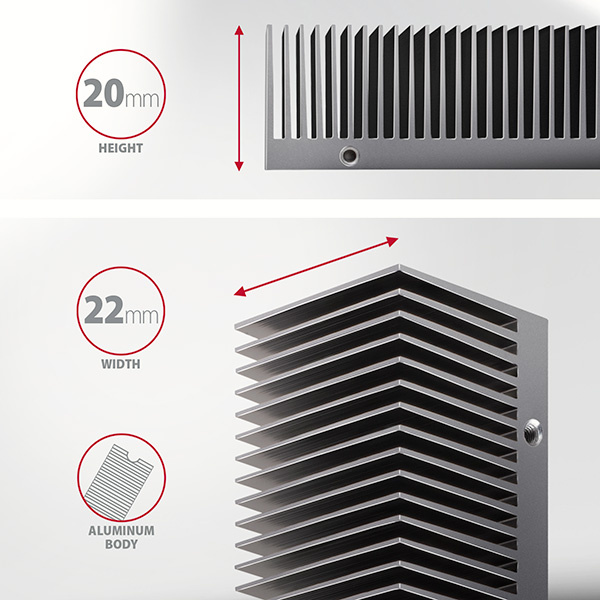 Díky své celkové výšce 24 mm a pasivu o výšce 20 mm, lze chladič umístit i do skříně s omezeným prostorem. Příčné žebrování hliníkového pasivu a kovový rámeček optimalizují odvod tepla z M.2 SSD disku, což může snížit teplotu disku až o 30 °C. Tím se prodlužuje životnost SSD disku a zabraňuje se zpomalení rychlosti disku, tzv. “Thermal Throttling”.
