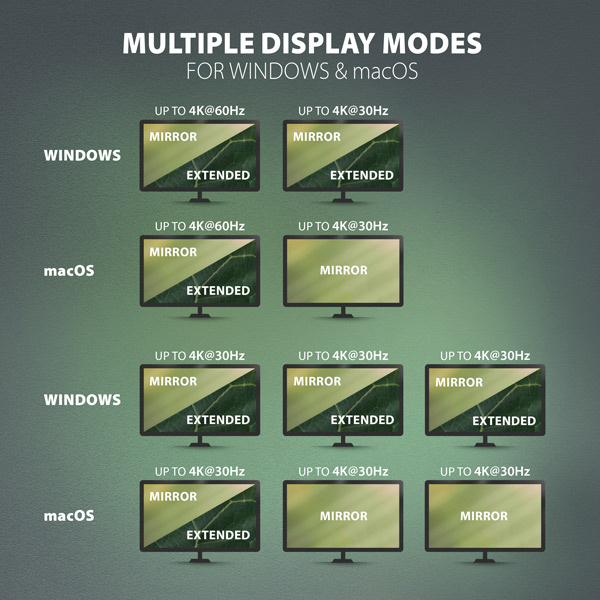 Každý ze tří video výstupů (2x HDMI + 1x DisplayPort) poskytuje kvalitní obraz až do rozlišení 4K/60Hz Ultra HD. Podporovány jsou také vysoké frekvence v oblíbených hráčských rozlišeních 2K/144Hz nebo FullHD/240Hz. I při připojení tří monitorů současně zvládne dokovací stanice zajistit rozlišení až 4K/30Hz na každém z nich. Díky podpoře HDR (vysoce dynamický rozsah) si můžete bez omezení vychutnat výrazně rozšířený rozsah barev a kontrastů. Pro správné fungování video výstupu je nutné, aby USB-C port notebooku podporoval DisplayPort Alternate Mode (DP Alt Mode) nebo Thunderbolt 3/4. Podpora výše uvedených max. podporovaných rozlišení a frekvencí vyžaduje připojení k počítači s DisplayPort verze 1.4.