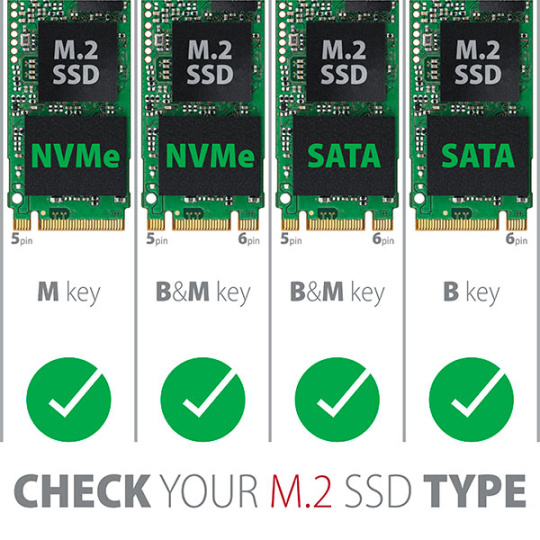 Adaptér podporuje použití SATA i NVMe (PCI-Express) M.2 SSD disků, jednostranných i oboustranných. Redukce nemá omezení kapacity SSD disků a lze použít M.2 karty všech rozměrů až do délky 110 mm. Samozřejmostí je fungování obou disků zároveň.