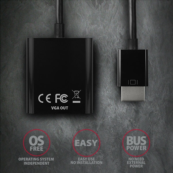 HDMI -> VGA aktivní adaptér AXAGON RVH-VGN pro připojení staršího VGA monitoru/TV/projektoru k počítači nebo jinému zařízení s výstupem HDMI. Redukci lze použít i se set-top boxy nebo herními konzolemi Xbox a PlayStation.