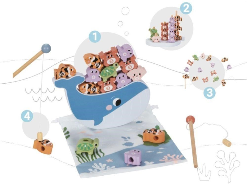 Soubor her Rybky 4v1 se skládá ze 4 oblíbených dětských her jako jsou balanční hra, dřevěná nasazovací hra, navlékání a rybolov, se společnou tématikou - oceánem, mořskými živočichy. Všechny tyto hry jsou vyrobené z přírodního dřeva a jsou zárukou velké zábavy, která přirozeným způsobem rozvíjí dětské dovednosti. Mořským motivem i barvami je sada her 4v1 vhodná pro holčičky i kluky..