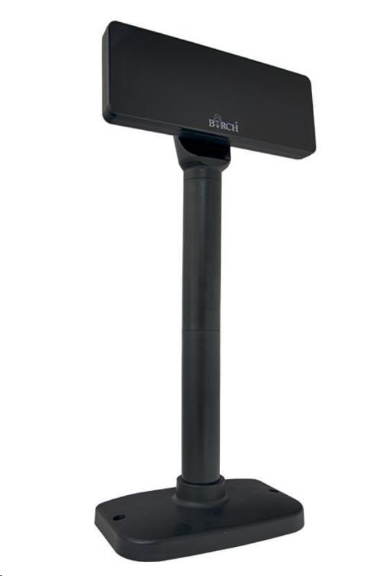 Birch DSP-V9 je zákaznický alfanumerický VFD displej k pokladním, poštovním a jiným přepážkám za bezkonkurenční cenu. Zobrazuje 40 znaků ve dvou řádcích velkým, vysoce svítivým písmem. Ovládání je prostřednictvím rozhraní USB nebo RS232 standardním příkazovým jazykem podle Vašeho výběru (LD220, DSP800, UTC/S, ESC/POS, AEDEX, CD5220 a další). Jeho hlavici lze horizontálně otočit až o 355°.