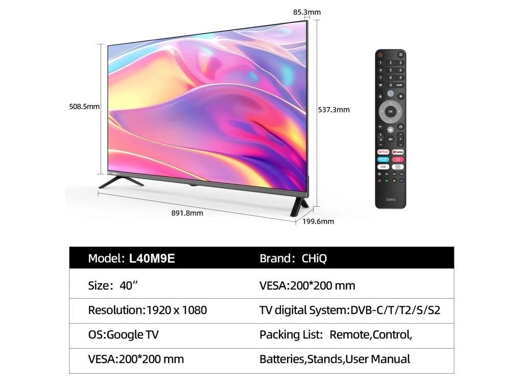 CHiQ 40“ L40M9E, metalická bezrámečková Smart Google TV s HDR10, HLG, obrazovkou s Full HD s rozlišením 1920 x 1080 pixelů, Dolby Audio a vylepšeným zvukem dbx-tv.