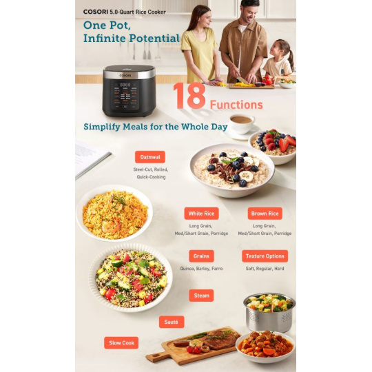 Multifunkční rýžovar Cosori nabízí různé možnosti přípravy pokrmů: různé druhy a úrovně přípravy rýže (podle chuti - standardní, měkká nebo tvrdší), kaše a jiné obiloviny, ale také další funkce jako režim pomalého vaření, vaření v páře, dušení, režim udržování teploty, odložené vaření, pečení nebo režim rychlé přípravy rýže.