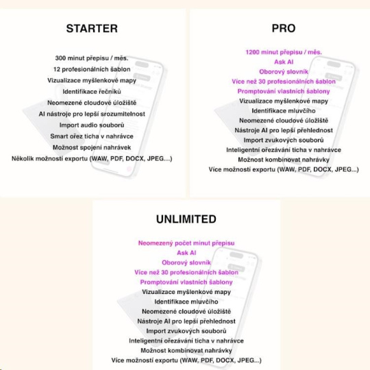 • Váš 3 v 1 asistent: Záznam, přepis, souhrn. 300 minut měsíčně zdarma
