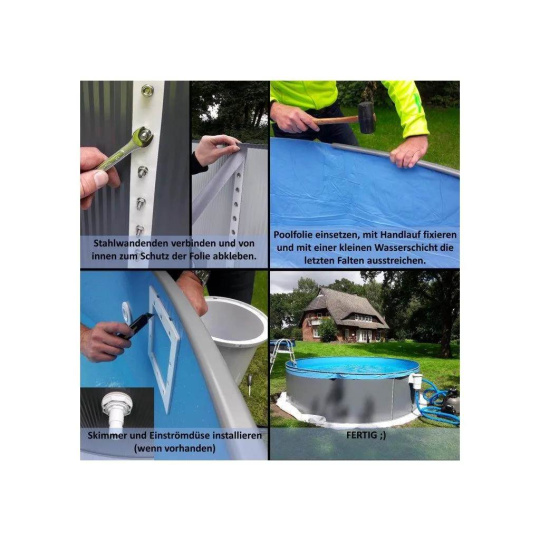 Bazén se instaluje pomocí spodních a horních lišt, do kterých se zasazuje ocelová stěna. Oba kraje stěny se propojí pomocí vnitřních a vnějších lišt a šroubů. Mrazuvzdorná folie se pomocí zalomení o horní část ocelové stěny zavěsí a vytvaruje do bazénu dle vizuálních požadavků. Folie je flexibilní a na míru vyrobena pro tento typ bazénu (není třeba žádných úprav). Pro montáž krok za krokem následujte pokyny v montážním návodu.