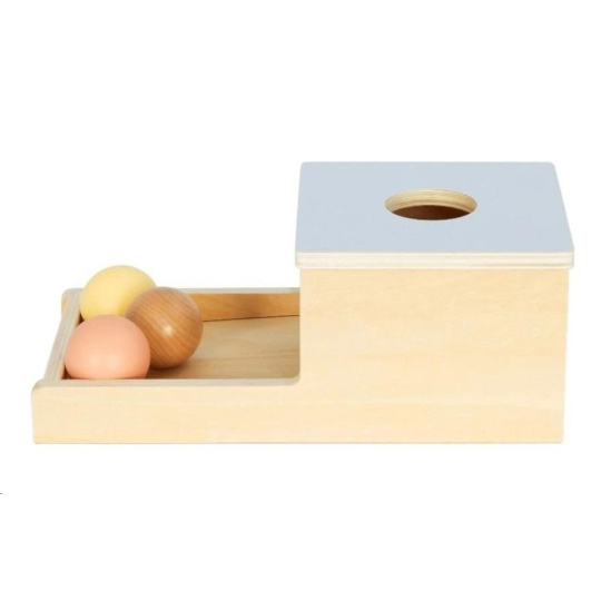 Dřevěný box (bedýnka) s dřevěnými koulemi v přírodních pastelových barvách seznámí miminko s vlastnostmi objektů (předmětů), v tomto případě dřevěných koulí. 3 dřevěné koule v přírodním provedení a v jemných pastelových barvách mizí v dřevěném domečku (boxu), aby se pak dveřmi vykutálely do dřevěné zahrádky (ohrádky). Tuto záhadu musí každé dítko vyřešit a tak bude tuto zábavnou činnost opakovat znovu a znovu. Při opakované hře děti zdokonalují své dovednosti, zabaví se a užijí si spoustu legrace.