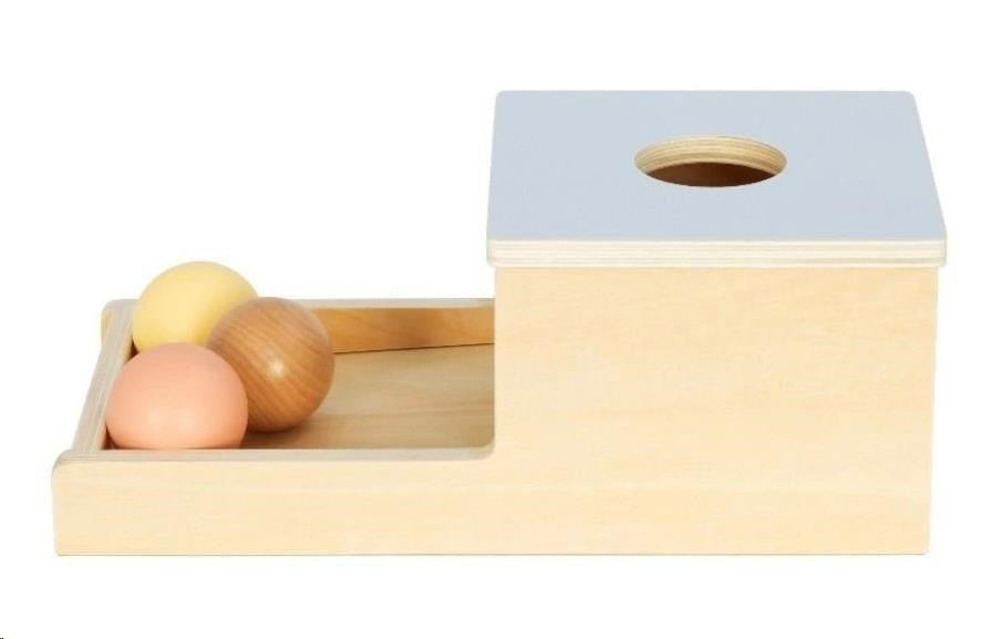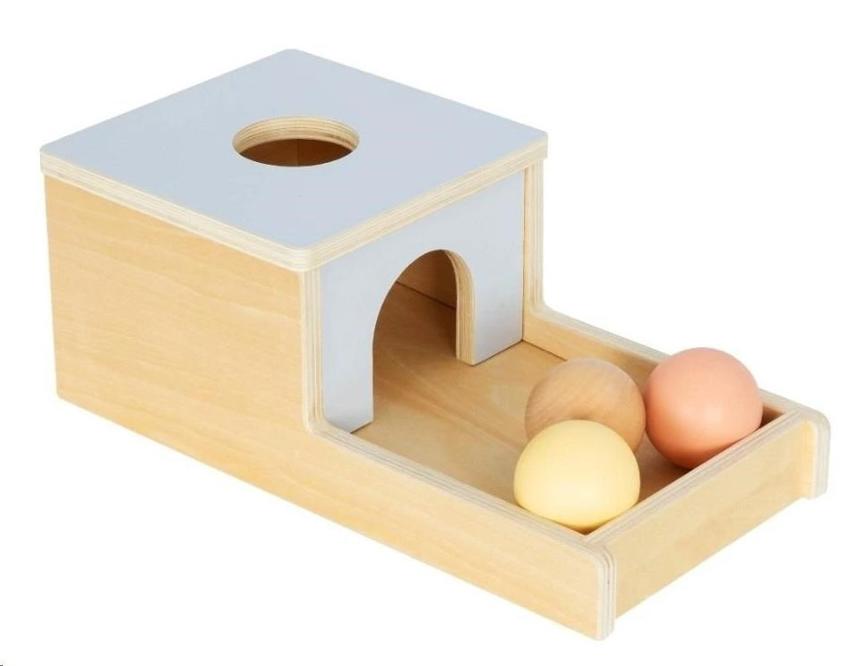 Dřevěný box (bedýnka) s dřevěnými koulemi v přírodních pastelových barvách seznámí miminko s vlastnostmi objektů (předmětů), v tomto případě dřevěných koulí. 3 dřevěné koule v přírodním provedení a v jemných pastelových barvách mizí v dřevěném domečku (boxu), aby se pak dveřmi vykutálely do dřevěné zahrádky (ohrádky). Tuto záhadu musí každé dítko vyřešit a tak bude tuto zábavnou činnost opakovat znovu a znovu. Při opakované hře děti zdokonalují své dovednosti, zabaví se a užijí si spoustu legrace.