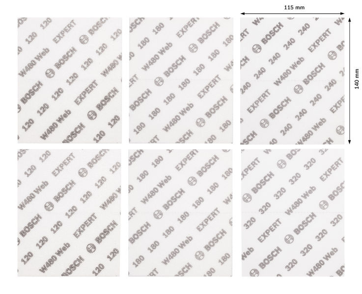 Bosch sada ručních brusných sítí EXPERT W480 Web 1/4, 115 × 140 mm, G120 (2×); G180 (2×); G240 (1×); G320 (1×), 6 ks