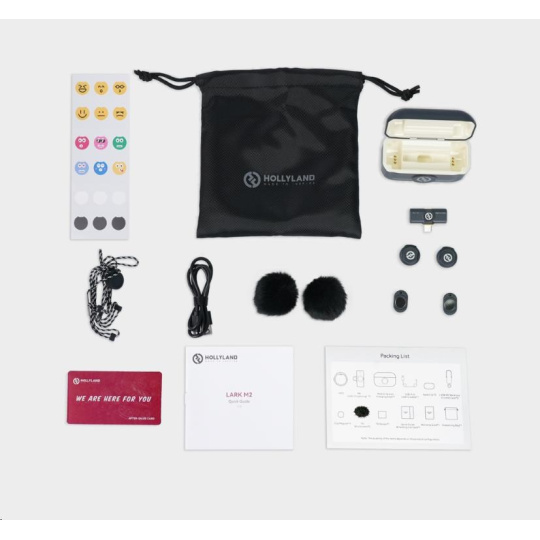 LARK M2 se dodává se sadou užitečného příslušenství, včetně větrných skel pro nahrávání venku, kabelových konektorů pro snadné připojení a speciálně vyrobeného náhrdelníku pro každý TX. S tímto příslušenstvím budete mít vše, co potřebujete k nastavení zařízení LARK M2 a k využívání jeho funkcí.
