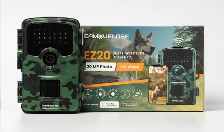 EZ20 Wildlife Camera Specifications: Color: Camouflage Video Resolution: Full-HD (1080P) Megapixel: 20MP File Format: JPG (Photo), AVI/H.264 (Video) Display: 2.4" LCD Screen PIR Sensors: 3 pcs Photo Speed: 0.3 seconds Night Vision Distance: 20 meters Detection Angle: 100° degrees Viewing Angle: 80° degrees Memory: Up t... více