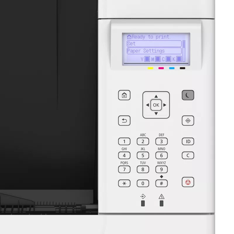Displej LCD s 5 řádky, 5 indikátorů LED (Online, Ready, Message, Job a Energy saver), tlačítka, číselná klávesnice s 10 tlačítky