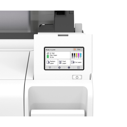 Funkční design panelu dotykové obrazovky s úhlopříčkou 4,3“ umožňuje intuitivní zobrazování pokynů a důležitých informací, jako je typ a zbývající množství média a množství inkoustu. Roli papíru lze snadno vyměnit na horním krytu s plochým povrchem.