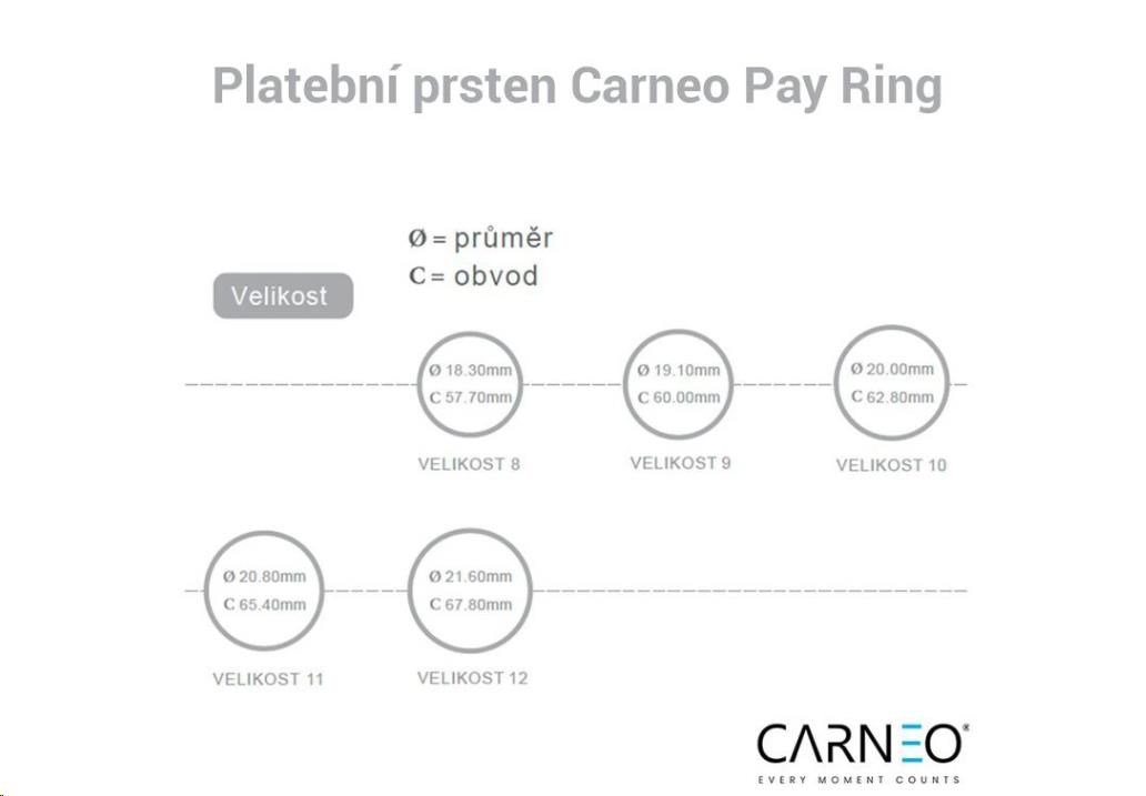 Elegantní platební prsten Carneo, vyrobený z prémiové odolné keramiky, kombinuje vysokou odolnost vůči poškrábání, vodotěsnost a komfort nošení. Platby jsou realizovány bezkontaktním způsobem přes technologii NFC, bez nutnosti nabíjení. Aktivace a správa probíhají jednoduchým párováním přes aplikaci Carneo Pay, která využívá tokenizaci platby, čímž zaručuje bezpečnost. Prsten je kompatibilní s Android i iOS zařízeními, je odolný proti vodě podle standardu IP68 a je k dispozici v několika velikostech.
