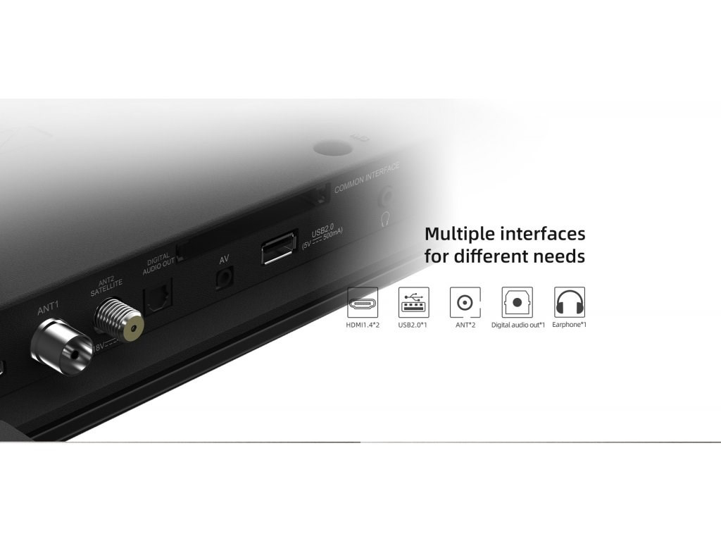 | Vstupy a výstupy | AV vstup mini, CI+, sluchátkový vstup 3.5 mm, digitální audio výstup, HDMI 1.4, USB 2.0, LAN, antény RF a LNB |