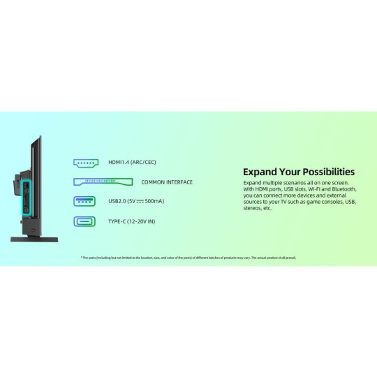 Vstupy a výstupy: USB-C, AV vstup mini, CI+, sluchátkový vstup 3.5 mm, digitální audio výstup, HDMI 1.4, ARC CEC, USB 2.0, LAN, antény RF a LNB