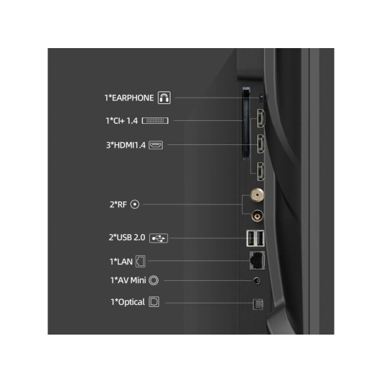 Vstupy a výstupy: AV vstup mini, CI+, sluchátkový vstup 3.5 mm, digitální audio výstup, HDMI 1.4, USB 2.0, LAN, antény RF a LNB