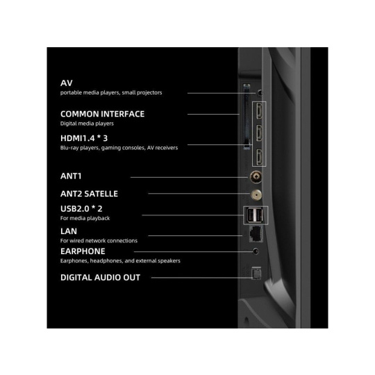 | Vstupy a výstupy: | AV vstup mini, CI+, digitální audio výstup, HDMI 2.1, USB 2.0, LAN, antény RF a LNB |