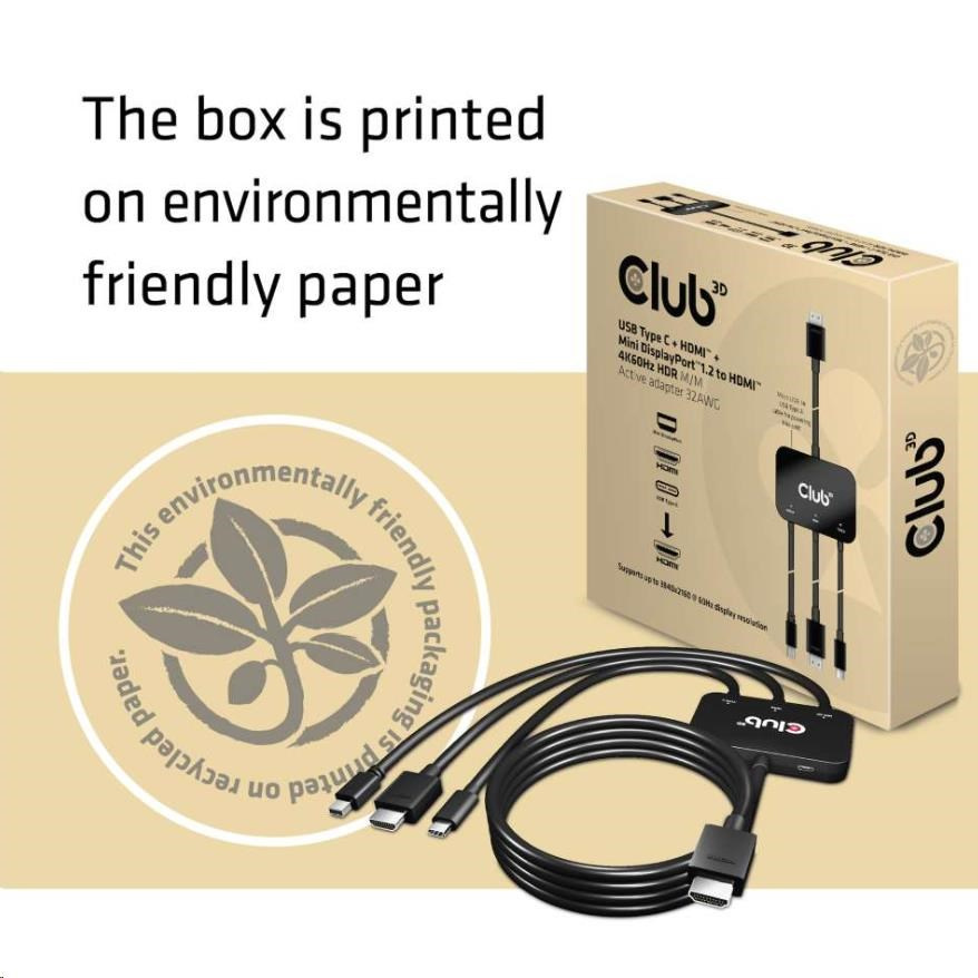 Club3D adaptér aktivní USB Type-C + Mini DP 1.2 + HDMI na HDMI 4K60Hz HDR, M/M, 32AWG