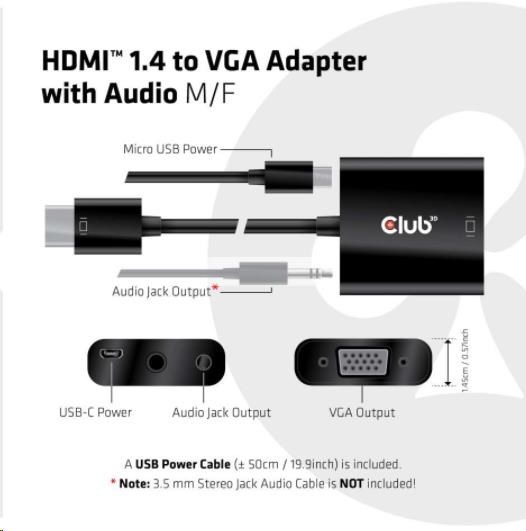 The Club 3D CAC-1302 is an active HDMI™ 1.4 to VGA signal converter. It allows you to convert digital HDMI™ signal into analog VGA signal and extracts audio signal from HDMI™ signal through the R/L audio port.